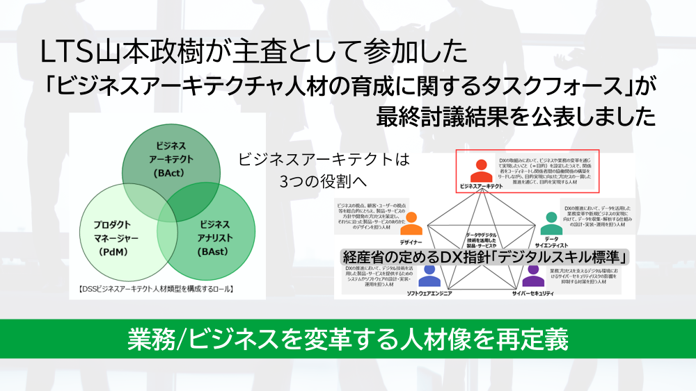 12月、経済産業省などが設置した「ビジネスアーキテクチャ人材の育成に関するタスクフォース(TF)」は「ビジネスアーキテクチャ人材の役割定義」(最終討議結果)を公表しました。このTFはLTS常務執行役員CSOの山本政樹が主査を務めています。今回、ビジネスアーキテクトなどの役割が国に定義されたことで、日本でもビジネスアーキテクトが認知され、そのニーズは高まるとみられます。